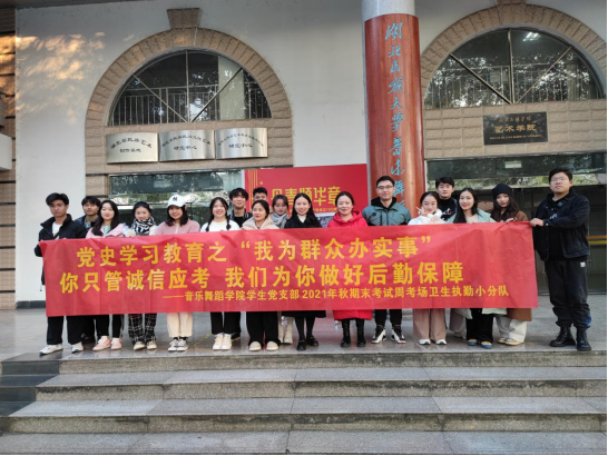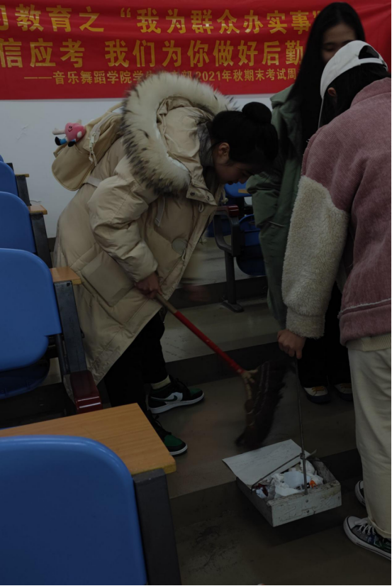 2021年临近尾声,为深化党史学习教育成果,在秋季期末考试周之际,音乐舞蹈学院学生党支部成立卫生执勤小分队,对学院各个教室进行卫生打扫,为全院考试工作做好做牢后勤保障,通过实际行动为群众办实事。