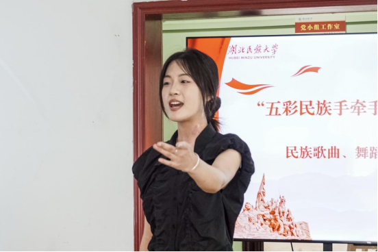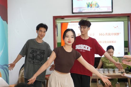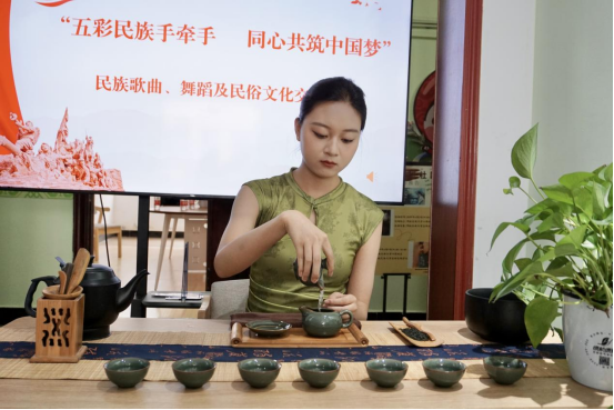 随后,现场师生进行了民族歌曲、舞蹈及传统文化交流展示。支部成员踊跃参加,《土家迎客歌》《筛子关门眼睛多》《门口一条冲》《六口茶》,土家族摆手舞等民族歌曲和舞蹈纷纷呈现,田景福部长热情的加入到了同学们的合唱之中,并与同学们就民族歌曲的背景、深意进行了解读。音乐舞蹈学院茶文化协会成员现场展示泡茶工艺,让与会人员深入了解中国茶文化的博大精深。