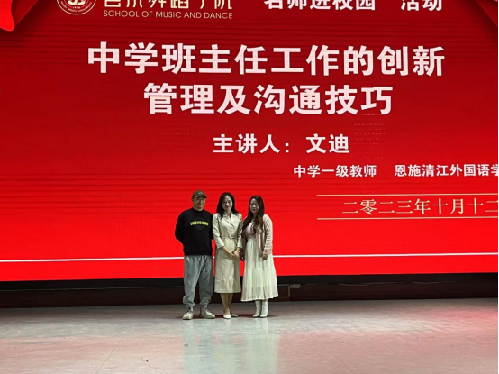 10月12日下午,恩施清江外国语学校一级教师文迪应邀来我院开展名师进校园专题讲座。本次讲座在演播厅举行,主题为“中学班主任的沟通技巧”,由音乐系副主任龙林担任主持人。21级音乐学、22级音乐学及22级舞蹈学专业学生聆听了此次讲座。