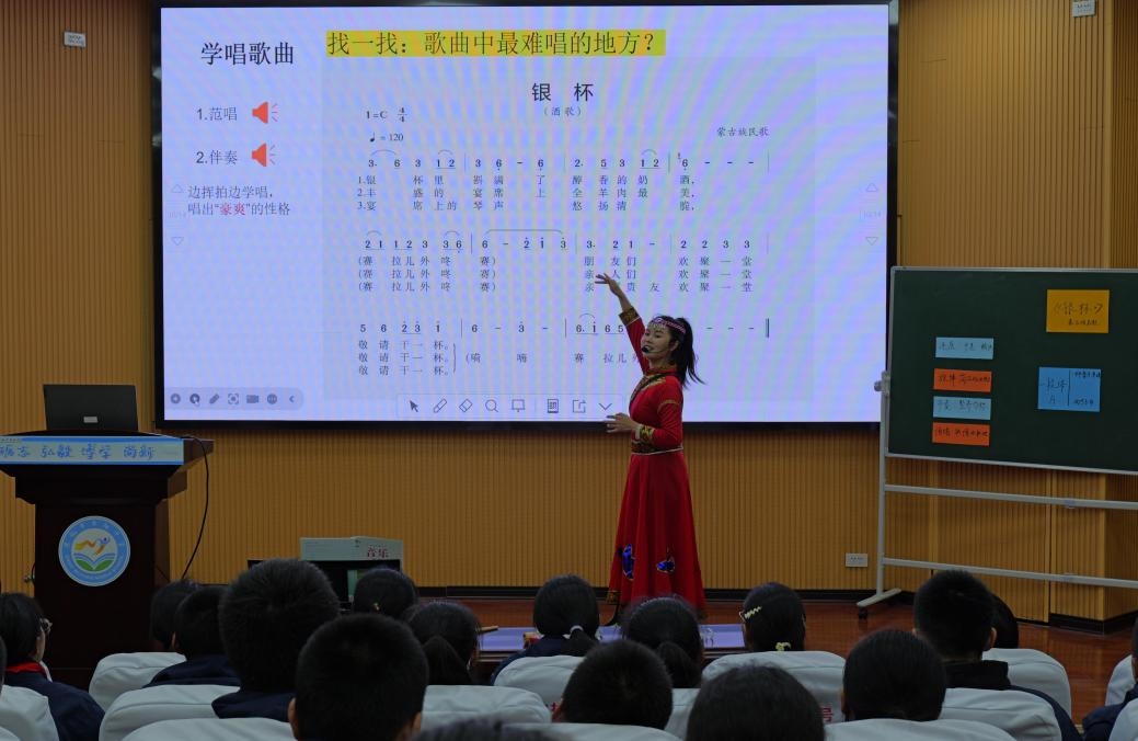 11月18日,全体师生观摩了肖秋燕老师的公开课——蒙古族歌曲《银杯》。该课程通过别开生面的蒙古舞表演开场,融合情景式教学、任务导学、小组合作,让学生自主学习、自主发现,在协作探索汲取作品内涵,从而更好地理解音乐所传递的情感。