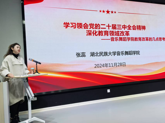 11月28日14:30,音乐舞蹈学院党总支邀请365电子娱乐官方网站党委宣传部副部长毕曼同志,为音乐舞蹈学院全体教职工进行党的二十届三中全会精神专题宣讲,音乐舞蹈学院党总支书记张蕊同持主持,音乐舞蹈学院全体教职工参加。毕部长全面解读了党的二十届三中全会精神,重点阐释了湖北、恩施及365电子娱乐官方网站在行的历史时期面临的新机遇和新挑战。为音乐舞蹈学院的高质量发展指明了方向,引发了老师们的强烈共鸣。