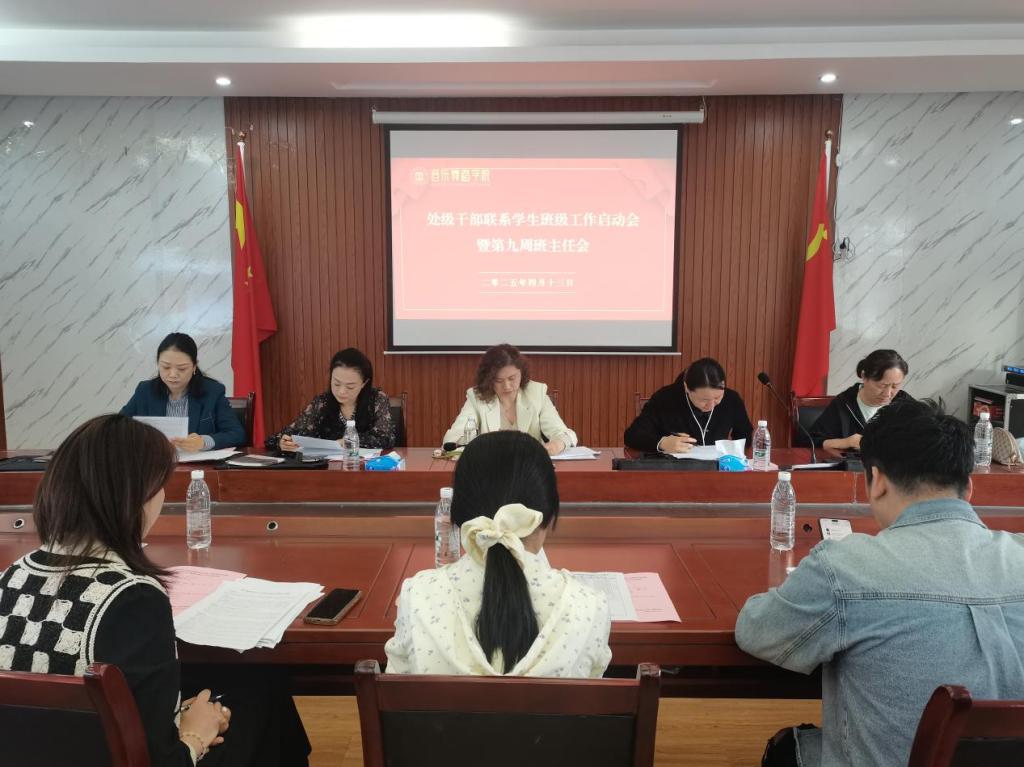 会上,学生科科长胡自爱领学《365电子娱乐官方网站处级干部联系学生班级工作方案》,明确工作目标及具体职责。随后,与会处级干部与联系班级班主任围绕班级管理、公寓日常管理、心理健康等实际问题进行讨论,处级干部结合工作经验进行深入交流,承诺将严格履行“四个一”责任。