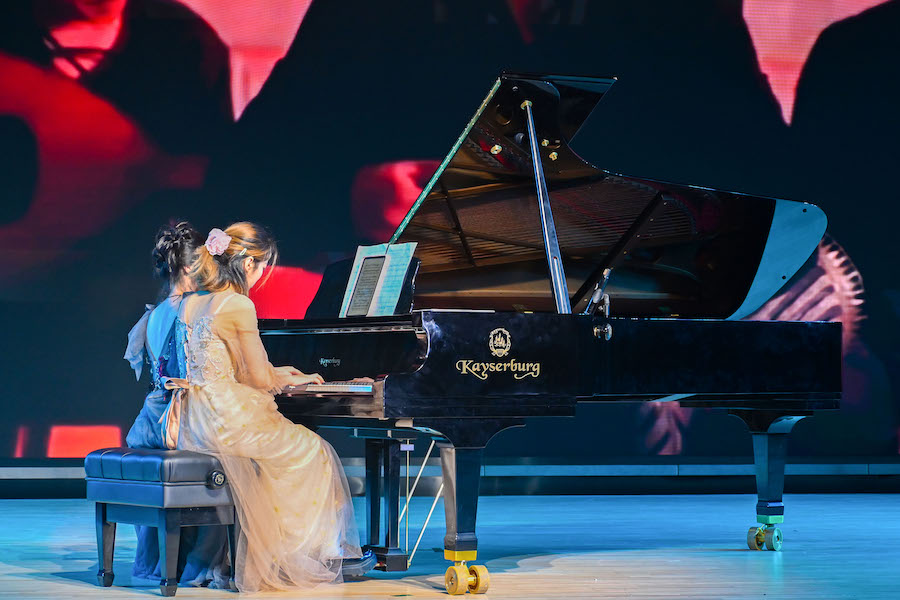 上篇,歌伴舞《春风十万里》中,舞者灵动的身姿与歌者悠扬的歌声完美配合,如诗如画,引领观众奔赴充满希望的远方。土家民歌《直尕思得》以其浓郁的地方风情,一声声婉转的旋律在巴山清江间回荡,唱出土家儿女的热情与甜蜜。女声合唱《卓玛》,用悠扬的旋律诉说着雪域少女的纯净与深情,男声合唱《欢乐的那达慕》,则以雄浑豪迈的歌声展现出草原盛会的激情欢腾,一刚一柔,共同谱写民族音乐的动人华章。钢琴四手联弹《自由探戈》《爱乐之城》,音符在指尖流淌,将自由的洒脱与浪漫的情愫融入其中。