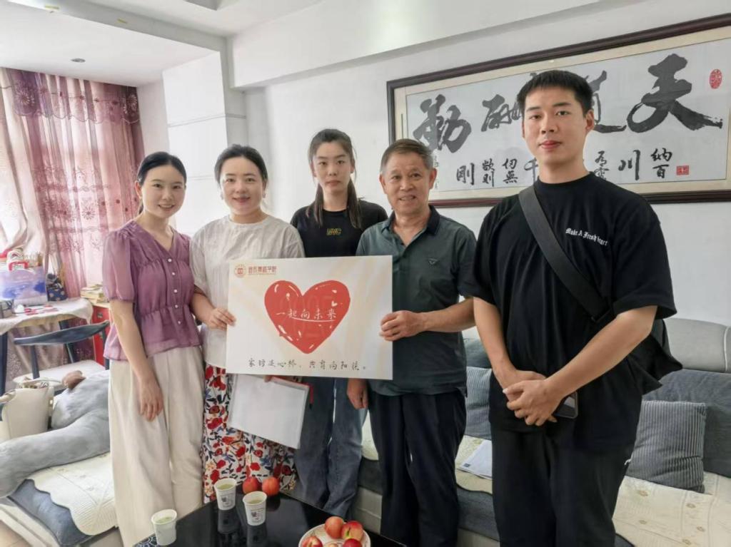 在曹同学家中,学生科科长胡自爱与其外公亲切交谈。老人欣慰地表示,曹同学从小懂事孝顺,主动分担家务。年级辅导员杨倩回应,曹同学在校期间品学兼优,勤奋刻苦,是同学们学习的榜样。双方就学生未来的学业与职业发展规划进行了愉快的交流。