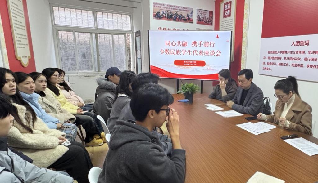 为铸牢中华民族共同体意识,深化民族团结进步教育,增进各民族学生交往交流交融,倾听学生心声、回应学生关切,12月7日下午,我院在“心语社区”召开“同心共融,携手前行”少数民族学生代表座谈会。院长谷秋阳、党总支副书记邓丽、学生科科长胡自爱、辅导员唐自君与来自多个民族的15名学生代表共同参会。座谈会由唐自君老师主持。