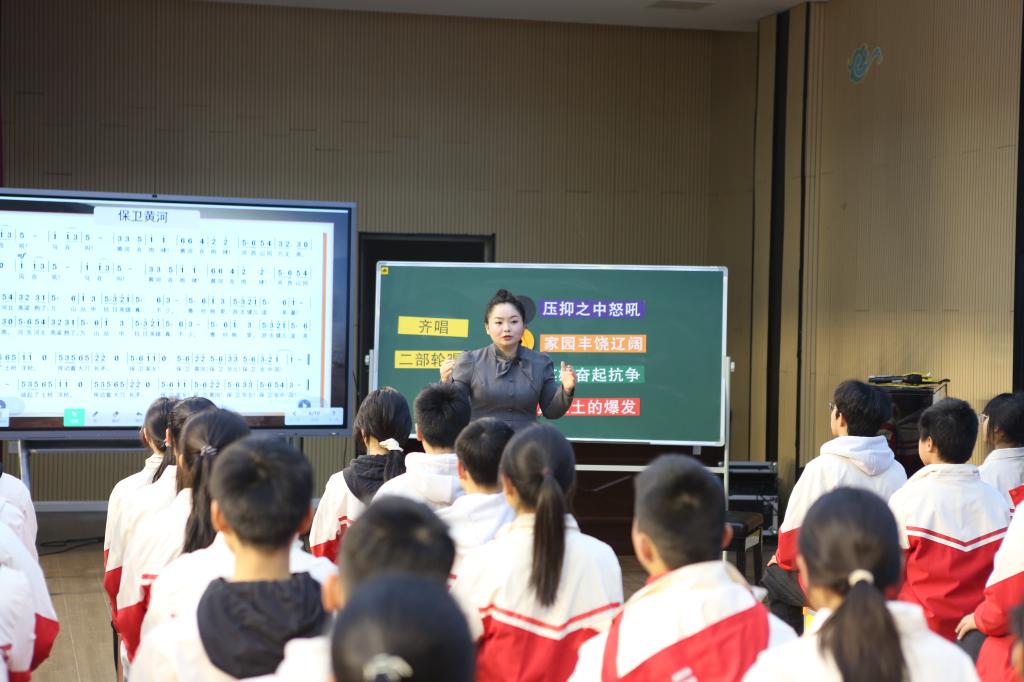 随后,全体参会人员沉浸式观摩了三节高品质示范课。清江民族学校陈新老师执教单元整体教学《缤纷舞曲》,以《蓝色的探戈》《雷鸣电闪波尔卡》《溜冰圆舞曲》三首作品为载体,引导学生深度聆听、主动探究;芳华初中刘婷婷老师聚焦戏剧与音乐融合,以经典歌剧《白毛女》为载体,通过情境表演、音乐赏析等方式让考点学习生动有趣;小渡船中学谭学小草老师打破学科边界,将音乐与文学、历史、思政深度融合,打造了一堂有温度、有深度的《黄河大合唱》。三节课立足不同学段、不同课型,生动呈现了核心素养导向下的音乐课堂新样态,为我院师范生提供了宝贵的观摩学习机会。