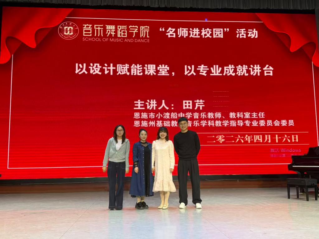 为切实提升音乐舞蹈学院师范生的职业备考能力与课堂教学实践水平,助力师范认证,4月16日下午14:30,我院在演播厅举办“名师进校园”活动,活动特邀恩施市小渡船中学音乐教师、教科室主任田芹老师担任主讲,主题为“以设计赋能课堂,以专业成就讲台”。2023、2024级音乐学,2023级舞蹈学学生参加,活动由副院长焦娜主持。