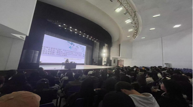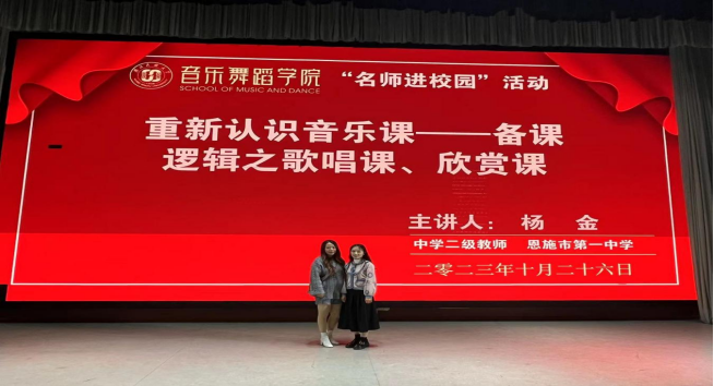 10月26日下午,恩施市第一中学二级教师杨金应邀来我院开展名师进校园专题讲座。本次讲座在演播厅举行,主题为“重新认识音乐课——备课逻辑之歌唱课、欣赏课”由音乐系主任张玲玲担任主持人。21、22级音乐学专业学生聆听了此次讲座。