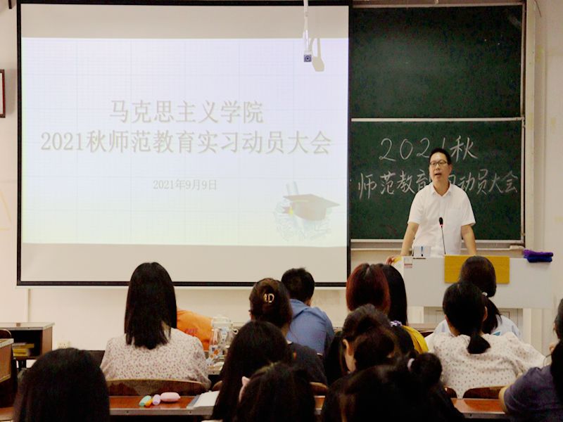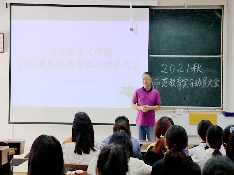 本网讯(通讯员 谭绍杰/文 董轩琳/图)9月9日下午,我院于德智楼9B108教室举行2021秋师范教育实习动员大会。我院副院长张明波、思想政治教育专业负责人宋祖红、教学科科长兰洁以及全体大四学生参与此次活动。本次活动由兰洁主持。
