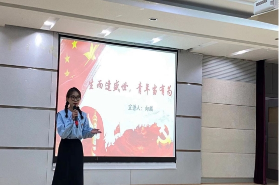 比赛过程中,各选手积极将党的二十大精神融入身边的生活实际,以小见大,表达了要用信仰肩负神圣使命,用担当诠释青年忠诚,用奉献践行青春誓言,争做政治坚定的追梦人、起而行之的实干家、敢于斗争的奋斗者的责任担当。比赛现场,参赛选手激情飞扬、声情并茂,充分展现出青春风采,现场气氛热烈。其中,一号选手罗淳心以“建功新时代,青春著华章”为主题,通过对红色文化、民族精神及身边青年战疫抗洪事迹的系列阐述,她呼吁吾辈青年要坚定信仰,刻苦钻研,以水滴石穿的毅力、只争朝夕的努力、坚如磐石的定力、舍我其谁的魄力,劈波斩浪、一往无前,让强国有我在实践中绚丽绽放。十号选手向麒以“生而逢盛世,青春当由为”为主题,以革命先贤的至理名言为突破口,通过脱贫攻坚、战疫一线及奥运赛场青年工作者、志愿者的奋斗事迹,充分展现了新时代青年人的使命担当,表达了新时代青年人以勇毅向前的姿态和积极向上的心态,在全面建设社会主义现代化国家新征程中勇当开路先锋、争做事业闯将的初心。