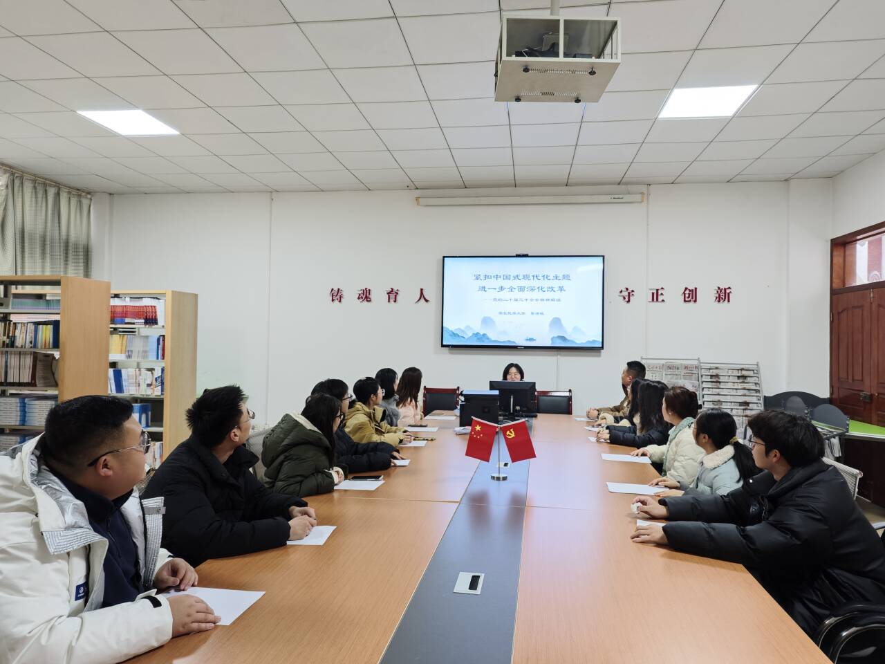 本网讯(通讯员 谢敏、熊海霞),10月30日,全国“双带头人”教师党支部书记“强国行”专项行动团队——365电子娱乐官方网站马克思主义学院思想政治教育系党支部书记、副教授蔡诗敏在德智楼三楼资料室开展题为《紧扣中国式现代化主题进一步全面深化改革--党的二十届三中全会精神解读》的党课。马克思主义学院研究生党支部书记刘轩男主持会议,研究生党支部所有党员参加。