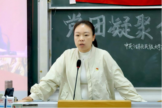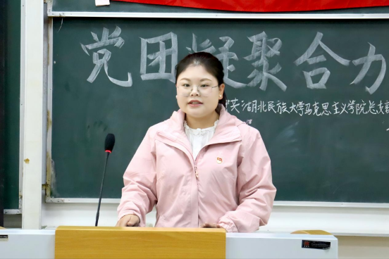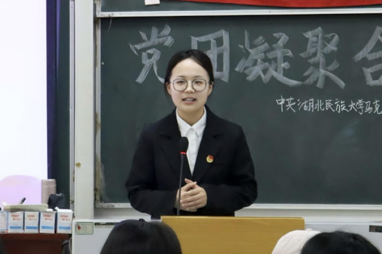 学生党支部书记杨婷为全体团员讲授团课。她以“厚植爱国情怀 赓续红色基因”为题,表示青年要厚植爱党、爱国、爱社会主义的情感,树立坚定的信仰、铸造高尚的灵魂、养成良好的品格。她提到,马克思主义学院正在进一步搭建“红色恩施”实践教学的载体平台,通过建立大学生社会实践教学基地,探索红色文化“导学、励学、润学”的育人模式,不断增强红色教育的针对性和实效性,全体团员青年要发挥带头作用,主动利用红色资源进行实地研学活动,把红色基因融入血脉,将红色厚植为人生奋斗的底色。