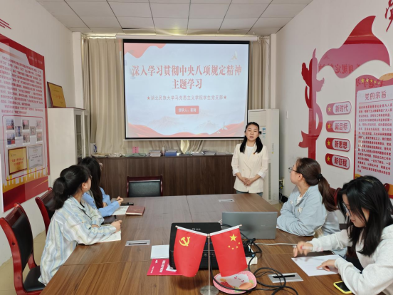 崔蕤同志带领全体党员深入学习中央八项规定核心内容与精神内涵,强调加强作风建设的重要性与必要性,同时督促各位党员要将中央八项规定精神与实际学习生活相结合。她指出学生党员要深刻认识到作风建设不仅是领导干部的“必修课”,更是全体党员的“基本功”,要在学习和生活中始终保持清醒的政治自觉,守纪律、严作风、作表率。