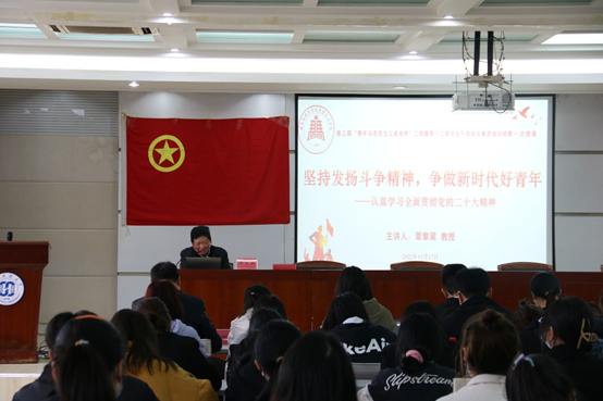 11月17日下午,我院第三期“青年马克思主义者培养工程”暨第十二期学生干部综合素质培训班开课典礼暨第一次授课于德智楼三楼多功能会议厅顺利举行。本次特邀恩施州委党校原常务副校长覃章梁教授作以“坚持发扬斗争精神,争做新时代好青年”为主题的第一次授课。我院党总支副书记张明波、副院长张胥、习近平新时代中国特色社会主义思想概论教研部主任宋祖红、学科建设科科长鲁帅、学生科科长杨婷、团总支书记毛召受邀出席。我院第三期“青年马克思主义者培养工程”培训班全体学员以及2022级全体学生干部参与此次活动。