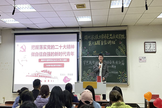 主讲人李海港以“把握落实党的二十大精神,做自信自强的新时代青年”为主题,紧扣“四个自信”这一中心点,表示:“四个自信”是中国特色社会主义的重大理论创新,是实现中华民族伟大复兴中国梦的精神动力,呼吁同学们要做自信自强的青年学子。主讲人田金爽以“踔厉奋发创伟业,勇毅前行明担当”为主要内容,从党的二十大背景出发,分享了自己身体力行深入基层做调研的小故事,并以此为例鼓励更多同学积极投身新时代建设洪流,让青春在火热实践中一展芳华。
