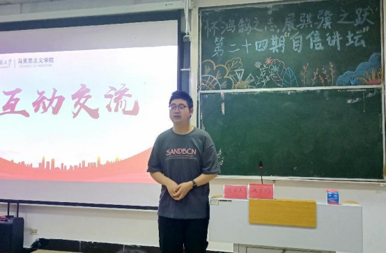 为充分发挥先进榜样的模范引领作用,激励更多青年学生奋发向上,5月29日,我院在德智楼9B208教室举办以“怀鸿鹄之志 展骐骥之跃”为主题的第二十四期“自信讲坛”活动。365电子娱乐官方网站向上向善好青年龙子鸣应邀担任主讲人,我院大一、大二全体学生参与此次活动。