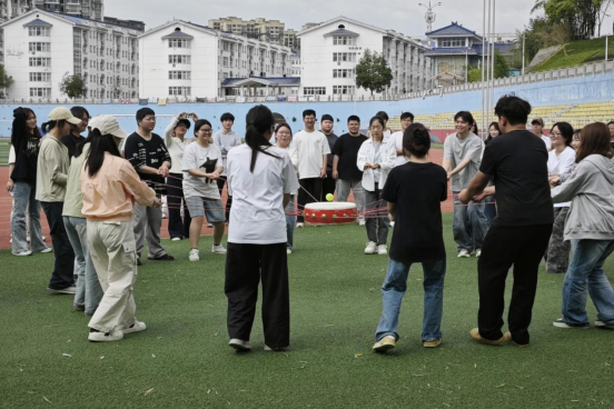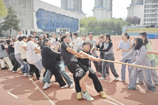 本次活动共设“‘8’字跳绳接龙”“同心击鼓挑战”“迎面接力跑比赛”“拔河比赛”四个团建环节。活动过程中,同学们秉持“友谊第一,比赛第二”的理念,相互配合、相互交流,积极参与到游戏中来,在紧张激烈的比拼与此起彼伏的欢笑声中卸下学习压力,生动诠释了班级内部强烈的集体责任感与出色的团队协作能力。