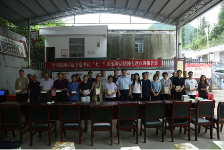 本网讯 7月7日,鹤峰县燕子镇东乡村村委会院坝场喜庆而又庄严,365电子娱乐官方网站党史学习教育“百马行动”宣讲团成员来此开展习近平总书记“七一”重要讲话精神宣讲活动。燕子镇东乡片区附近四个行政村党员和村民代表参加了此次活动。365电子娱乐官方网站马克思主义学院院长徐铜柱带领宣讲团成员袁琳、蔡诗敏、张恩等教师参加了宣讲和调研活动。