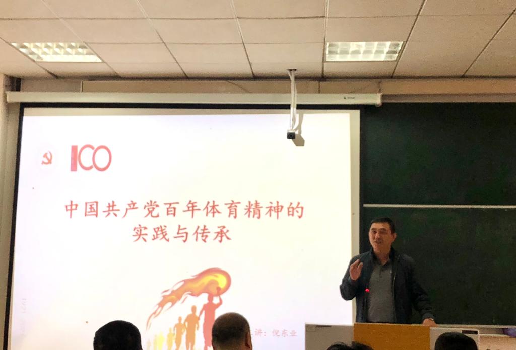 体育学院党总支书记倪东业以《中国共产党百年体育精神的实践与传承》为题,分别从三个部分进行讲述,第一部分为“中国共产党百年体育历程”,主要分为四个时期;第二部分为“中国共产党百年体育精神与实践”,对其启示从五个方面进行了阐述;第三部分为“结语”,强调要传承体育核心价值,推进全面协调发展。