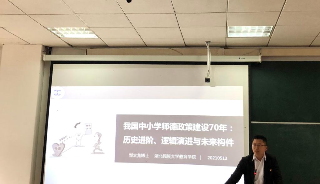 教育学院邹太龙博士以《我国中小学师德政策建设70年:历史进阶、逻辑演讲与未来构件》为题,分别从四个部分进行讲述,第一部分对“师德”进行了简要的解读,分别讲述了何谓“教师”、何谓“道德”、何谓“师德”;第二部分为“我国中小学师德政策建设的历史进阶”,主要划分为规范垦拓期、机制探索期和体系深化期三个阶段;第三部分为“我国中小学师德政策建设的逻辑演进”,主要分为“逻辑”之静、“价值”之变、“架构”之变和“内容”之变四个方面;第四部分为“我国中小学师德政策建设的未来构件”,分别从三个方面进行讲述,强调要建立健全“三全“德育机制,要有所提高。