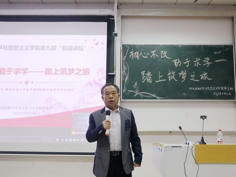 本网讯(通讯员 谭绍杰 田金爽/文 钟静双 黄丽兰/图)4月12日晚,我院于德智楼9B208教室举办以“初心不改,勤于求学——踏上筑梦之旅”为主题的自信讲坛活动。本次活动特邀请我校医学部中医学专业48岁优秀学生王野飞担任主讲人。我院团总支书记毛召受邀出席,全体大一、大二学生参与此次活动。