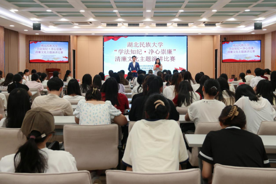6月20日,学校在德智楼三楼多功能报告厅举办以“学法知纪、净心崇廉”为主题的清廉文化演讲比赛,本次比赛由学校纪委、校团委、马克思主义学院、廉政文化研究中心联合举办。党委组织部副部长罗兴武,纪委、监察专员办公室综合室主任万力,校团委副书记刘亚琼,党委办公室、校长办公室副主任尼继珍,党委宣传部副部长毕曼受邀担任此次比赛评委。学校纪委副书记、三级高级监察官曾祥华,党委委员、马克思主义学院院长徐铜柱,校团委书记吴珊,马克思主义学院党总支书记向驰受邀观看比赛。