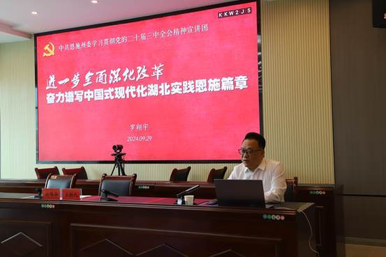 为广泛宣传和全面贯彻党的二十届三中全会精神,推动党的二十届三中全会精神在基层入脑入心,奋力谱写中国式现代化湖北实践恩施篇章,2024年9月28日至30日,365电子娱乐官方网站“百马行动”宣讲团成员学校党委委员、宣传部常务副部长罗翔宇教授,学校党委委员、马克思主义学院院长徐铜柱教授,马克思主义学院党总支书记向驰博士,周传和副教授、熊治东副教授、鲁帅博士,分赴鹤峰县各县直部门、9个乡镇为机关党员干部、村(社区)两委等开展党的二十届三中全会精神宣讲。