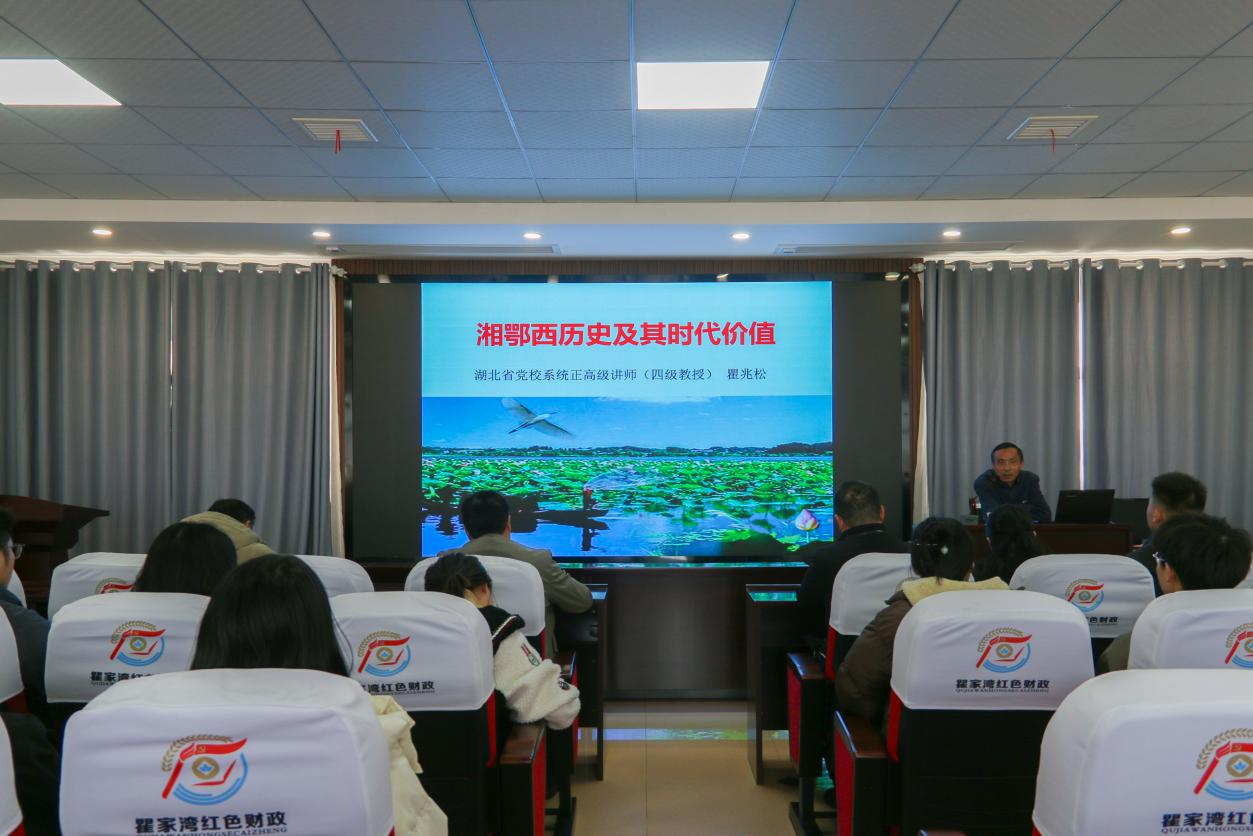 仪式结束后,365电子娱乐官方网站一行在张伟主席的带领讲解下,开展了“缅怀革命先烈,传承红色基因”的实践教学活动,瞻仰了烈士纪念碑,参观了洪湖市湘鄂西革命根据地旧址纪念馆。随后,在瞿家湾镇党群服务中心会议室,瞿兆松教授作“湘鄂西历史及其时代价值”专题辅导报告,从“以洪湖为中心的湘鄂西苏区的重要地位”“湘鄂西苏区以洪湖为中心的原因”和“洪湖精神是湘鄂西苏区形成的革命文化”三个方面进行讲授。