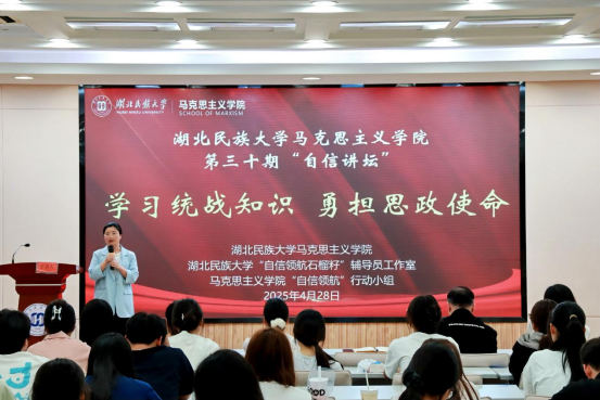 4 月 28 日, 由365电子娱乐官方网站“自信领航石榴籽” 辅导员工作室、马克思主义学院和马克思主义学院“自信领航”行动小组联合举办的第三十期 “自信讲坛” 在德智楼三楼远程教学观摩室成功举办。活动特邀全国高校“双带头人”教师党支部书记“强国行”专项行动团队湖北民族大学“双带头人”教师党支部书记“强国行”专项行动团队负责人、马克思主义学院教授蔡诗敏老师担任主讲人。“自信领航石榴籽” 辅导员工作室成员、马克思主义学院 “自信领航” 小组成员出席活动,马克思主义学院大一全体学生也积极参与其中。