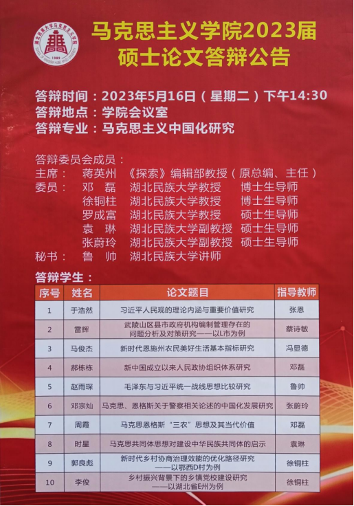 马克思主义学院2023年硕士毕业论文答辩公告一