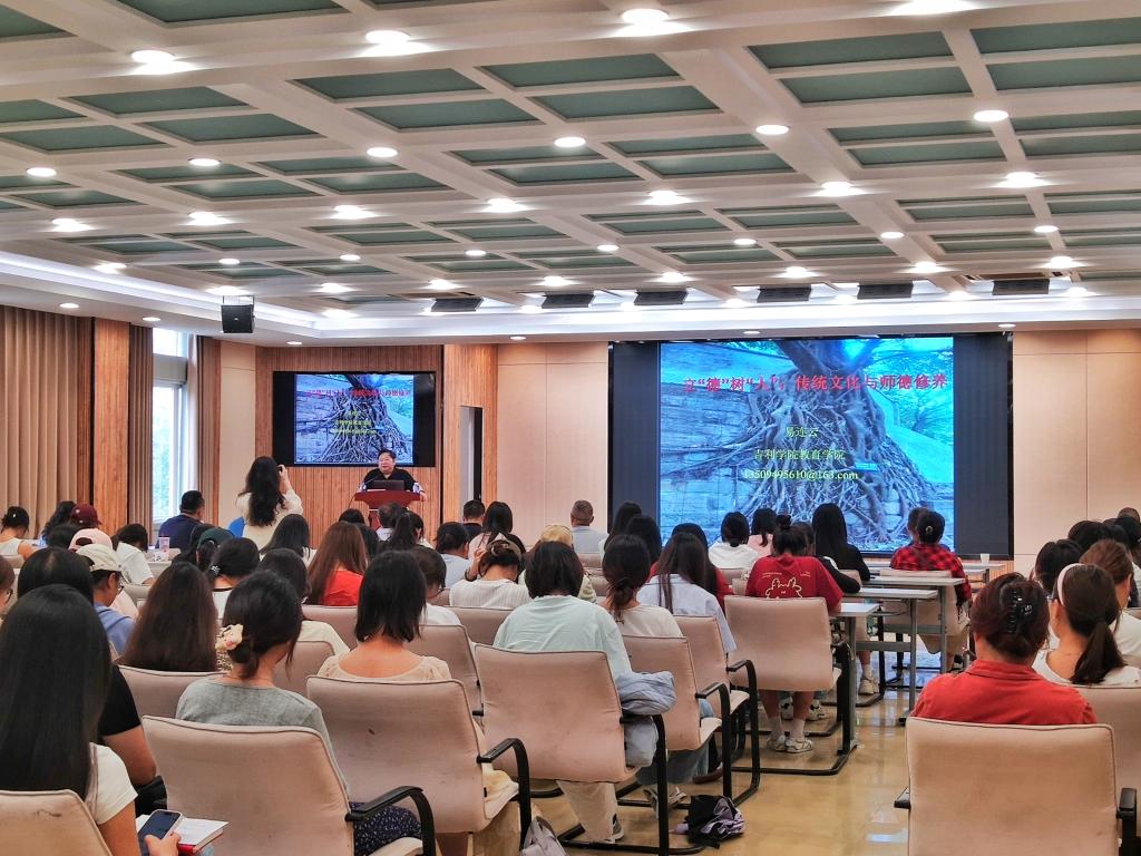 讲座伊始,易连云教授以立德树人中的“树”字为切入点,结合自身丰富的人生阅历,深入揭示“立德树人”的核心要义。他指出,“树人”的“树”是种树的“树”,而非塑造的“塑”,提出“树人”而非“塑人”的教育理念。易教授结合自己的成长经历,强调德育在个人成长中的关键作用。在讲座中,易连云教授巧用树木生长的比喻解读传统文化的内涵与价值。他形象地指出,“传统不是博物馆里的标本,而是流动的文化血脉。”为凸显传统文化的独特价值,他以儒家“仁爱”思想为例,对比中西方价值观差异,诠释了中华优秀传统文化的崇高境界。此外,易教授结合案例,深入剖析了师德失范的深层原因,他将师德修养的外在规范比作“化妆”,强调内在自律才是“修心”,批判了空有光鲜表象却行不义之事的行为。