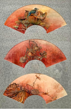 作品简介:秋荷不仅是一个具象的植物,还代表着人的一种生命状态和可贵精神,即使在秋风萧瑟中,折腰枯黄,却也依旧荡漾着洁净的生命气息。作者在毕业创作中选取秋荷的形象,运用中国花鸟画扇形小品的形式表达自己强烈的思想情感,实现事物的与现实的美好结合,展现秋荷在中国花鸟画中的意境美,以此来致敬疫情中艰苦奋斗的每一个人,歌颂逆行者们在困境中不抛弃、不放弃,携手共克时艰,顽强拼搏的精神。我们要学会如同秋荷一般,在面对困境混乱时,仍旧充满信念和勇气,与困难做着抗争。我们要富有秋荷一般的精神力量,坦然守住每一瞬的岁月静好,守住每一刹的凋零败落,不断走向生命的成熟,直至深埋在泥土之下为下一段盛世繁华做着贡献,其真正的意义与价值即在于生命的传递,是生生不息的生命的轮回,希望的轮回。
