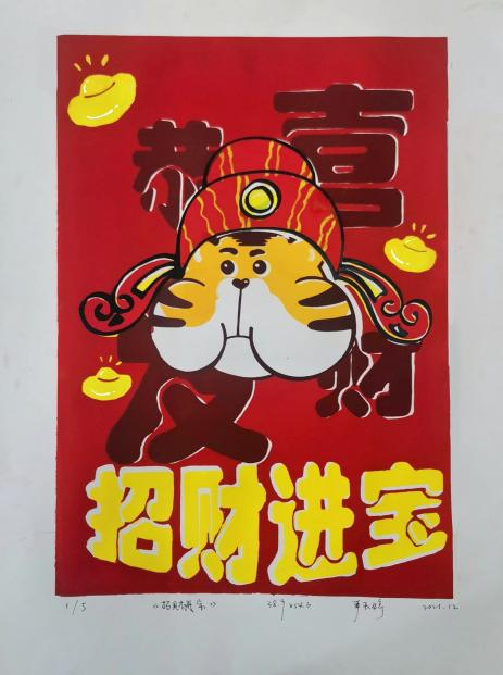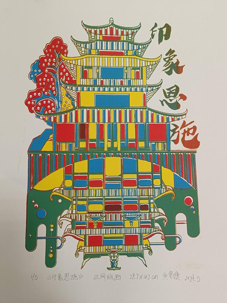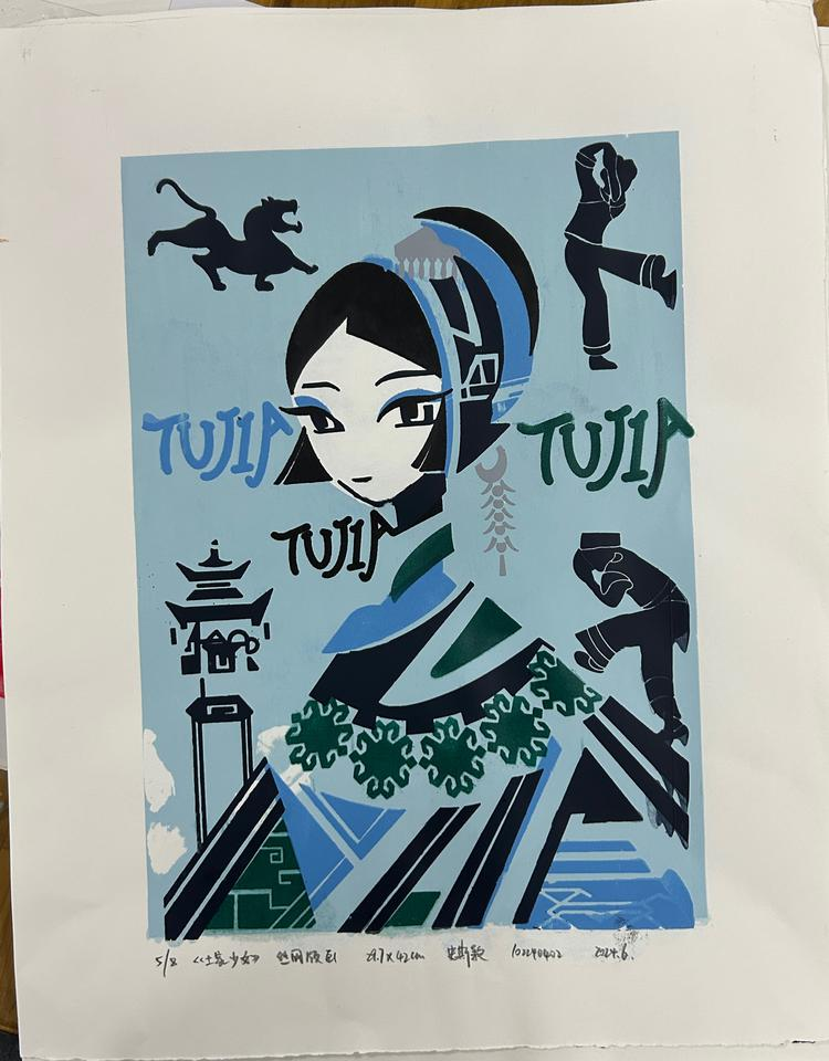 工作室开设黑白木刻、丝网版画、套色木刻等核心课程,其中套色木刻课要求学生通过 5 次分版套印完成主题创作,在掌握分版分色技法的同时,将土家族吊脚楼、西兰卡普纹样等地域文化元素转化为版画语言;丝网版画则结合视觉传达专业特色,通过 “非遗纹样文创设计” 等项目实现艺术创作与实用设计的跨界融合。工作室创作成果涵盖传统木版与现代丝网版画,尤以土家族文化系列作品为代表,其将少数民族建筑、织锦等元素与版画技法深度融合,成为地域文化传承的标志性成果,作品多次入选省级以上展览。