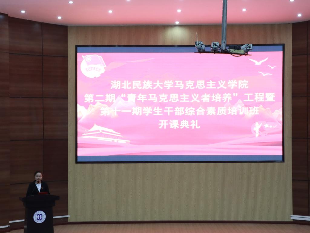 本网讯(记者 段天义/文 见习记者 高思琴/文 韩茜茜/文 张敏/文 记者 田慧/图 见习记者 吴文均/图)11月4日,我校马克思主义学院于图书馆模拟法庭准时举行第二期“青年马克思主义者培养”工程暨第十一期学生干部综合素质培训班开课仪式。马克思主义学院党总支书记罗成富、马克思主义学院学科建设科科长张恩、马克思主义学院团总支书记毛召、以及校团委和各二级学院学生代表应邀出席本次开课仪式。