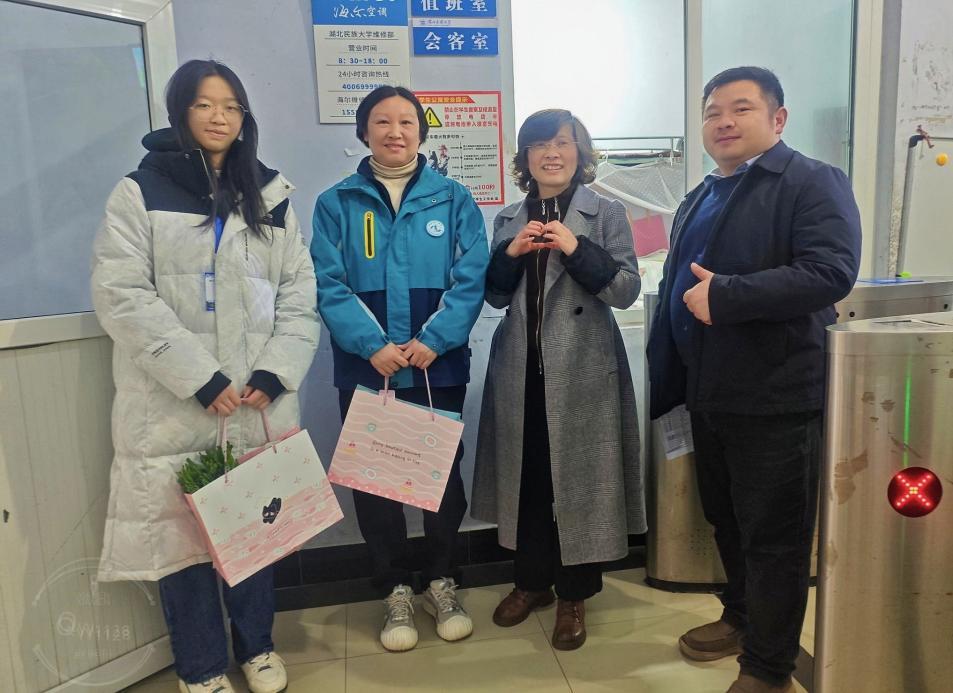 真情慰问送暖,师者关怀备至。学院领导走进各寝室楼值班室,与宿管阿姨亲切交谈,详细了解她们的工作日常和身体状况。郑敏副书记对宿管阿姨们多年如一日坚守岗位、用心用情服务学生的奉献精神表示高度赞扬,肯定与感谢她们在学院学生管理与服务工作中作出的辛勤付出,同时叮嘱大家在忙碌之余注意劳逸结合,保持良好的身心状态。