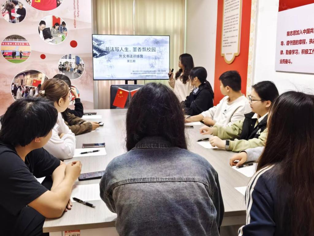 为深化校园文化建设,搭建跨学科语言学习交流平台,4月16日,外国语学院在博学七栋书香社区一站式综合服务站,成功举办“书法写人生,墨香飘校园”第五期外文书法训练营。本次活动由学院学生党员担任指导教师,面向非外语专业学生开放,以笔墨为桥,让外文书法之美浸润校园。