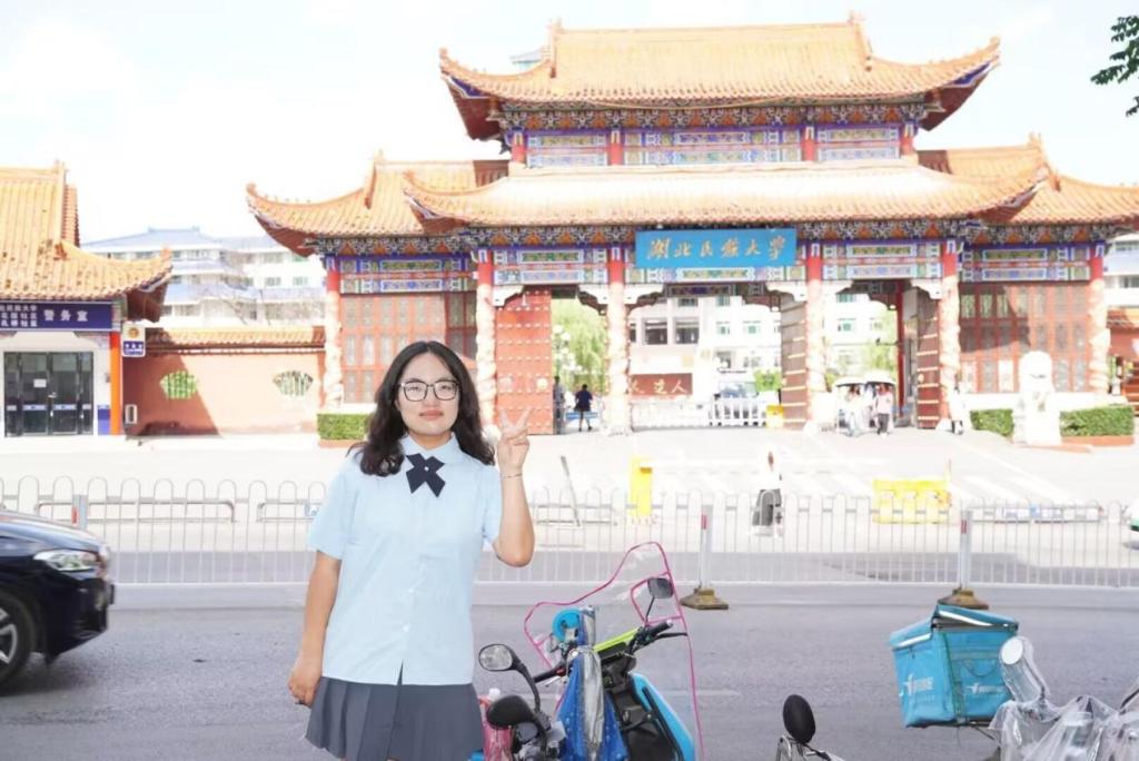 在这段成长旅程中,她有幸遇到了向驰老师,一个特别关心她的人。“与自己的工作谈一场轰轰烈烈的恋爱!”向老师赠予她的这句话,一直是激励她不断遇见更好自我的动力。她清晰记得,自己的第一篇原创推文获得老师在例会上的表扬时,那份喜悦无以言表。在之后的工作中,无论是她所做的人物通讯、民族文化节报道,还是各类原创推文,以及带领青年媒体中心取得的各项成就,都得到了老师的肯定和鼓励。这份认可成为她不断前行的动力源泉。尽管后来向驰老师因职位变动不再是青年媒体中心的指导老师,但老师依旧关注她的学习、生活和思想进步。这也让她有了更坚定的目标,积极向党组织靠拢,立志成为一个像向老师一样的共产党员——甘于奉献,散发光芒,成为一个充满力量的人。