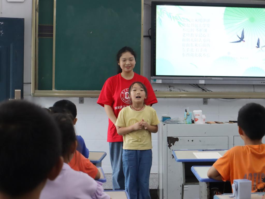 其中,“普通话课”围绕“朝”字展开互动性教学,团队成员从口部操、声母和韵母练习及多音字辨析等环节进行话题讨论,现场示范和教学普通话的正确发音和流利表达,引导孩子们字正圆腔说地普通话。同学们表示,通过此次课程的学习,对于普通话水平的提升有很大帮助。