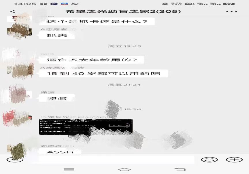 完成社区走访后,团队前往周边盲人按摩店,介绍团队项目并开展交流调研。店员积极响应加入志愿服务群,团队留下服务群聊的联系方式及项目二维码,以便后续通过线上渠道进一步推进项目在盲人群体中的传播与普及。