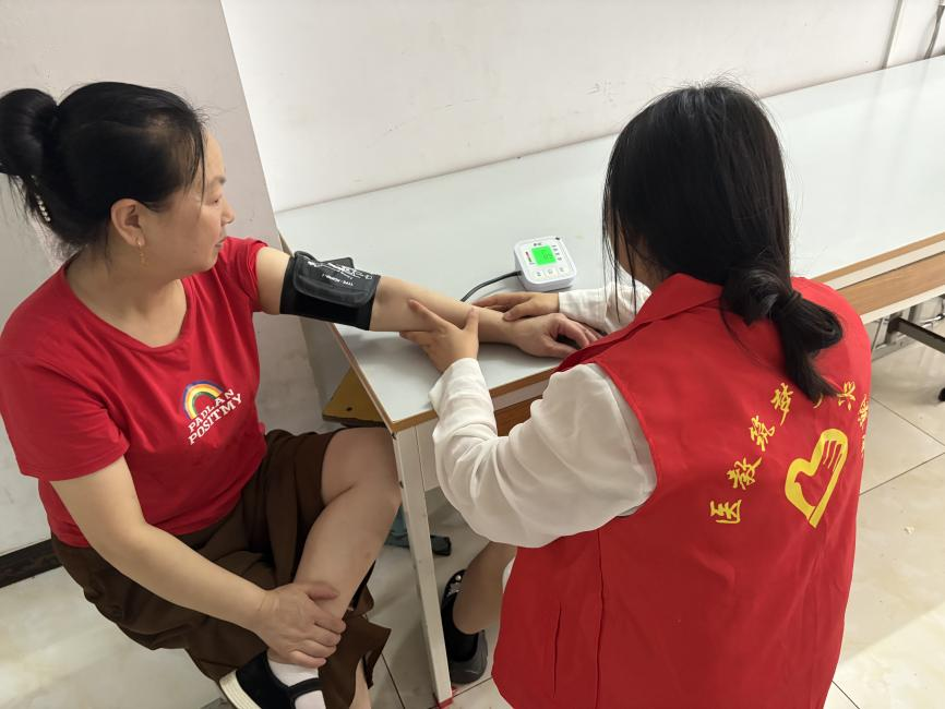 活动现场,志愿服务队分工明确,有序推进各项工作。在血压血糖测量区,队员们耐心为居民测量指标,详细记录数据。发现测量结果异常的居民,队员们会细心提醒日常注意事项,并建议其前往正规医疗机构进一步检查。健康知识宣讲区内,志愿者围绕常见慢性病防治、夏季养生、合理用药等主题,用通俗易懂的语言科普健康知识,并发放团队成员精心制作的健康手册,内容涵盖预防疾病的常识、急救知识、健康生活方式等内容,为居民打造实用的“随身健康指南”。