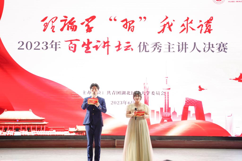 6月5日晚,我校2023年“百生讲坛”校级优秀主讲人决赛在音乐舞蹈学院演播厅顺利举行。我校党委统战部副部长陈妍,党办、校办副主任尼继珍,学生工作处副处长李建华,校团委副书记彭弥,党委宣传部理论教育科科长谭婷婷受邀出席并担任评委。