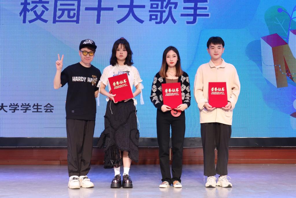 比赛伊始,十位选手共同亮相,以一首《青春》唱出青年不愧时代、不负韶华,昂扬向上的人生态度,彰显出我校学子的生气蓬勃;四号选手黄奕深情演唱《父亲写的散文诗》、《屋顶》,歌声温柔悠扬、婉转动听,抚慰听众内心,屡屡引发共鸣;五号选手张芮洁对于《裹着心的光》的歌唱也令人称赞,她以独特鲜明的音色和轻松欢快的舞台氛围为观众带来一场视听享受;八号选手苏杭极致演绎歌曲《保留》,将内心的挣扎与踌躇表现的淋漓尽致,触动人心,现场掌声雷动;谭若冰老师倾情献唱《本草纲目》,希望我校学子要坚定文化自信,传唱文化经典,用歌声讲好中国故事。最终,来自生物科学与技术学院的闻医以9.812的高分荣获本次大赛的冠军。