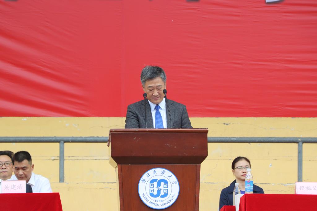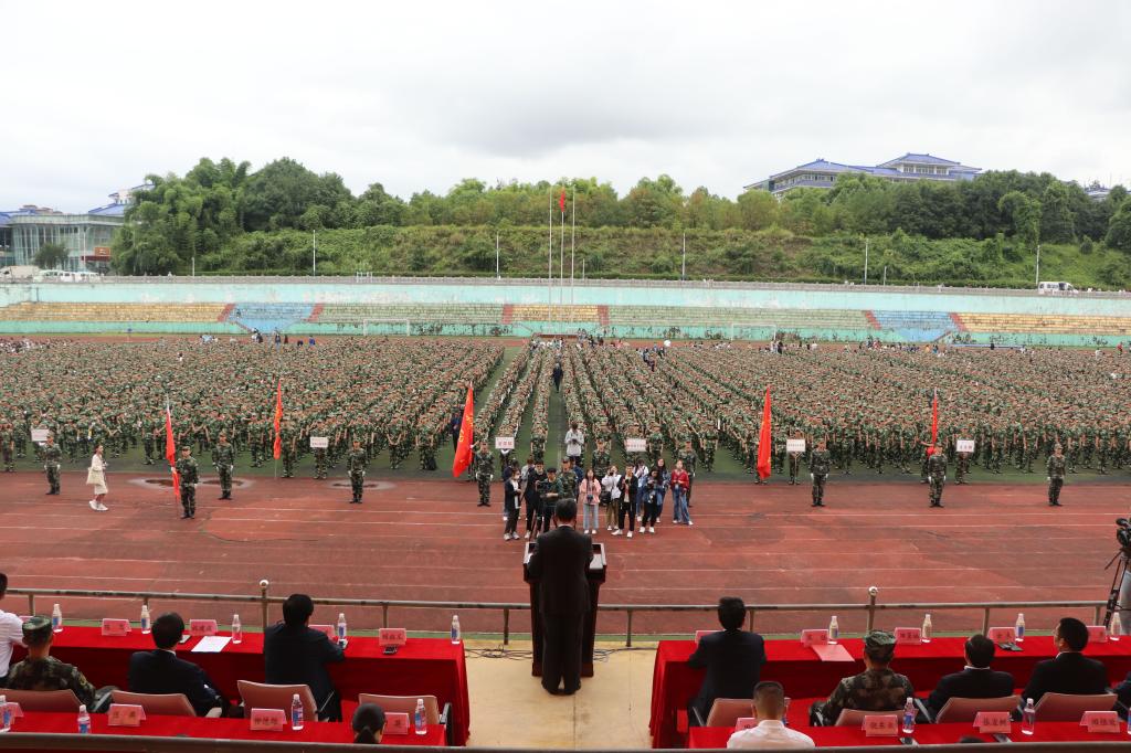本网讯(记者 王语 黄玉晶 侯默/文 王媛 廖子怡/图)9月21日,2020级新生开学典礼暨军训动员大会在五环体育场举行,党委书记吴建清,校长、党委副书记顿祖义,党委、纪委书记田景福,党委副书记、副校长汪兴平,党委常委副校长祝建波,恩施州武警支队队长宋强,党委团委总会计师余来,军训团参谋长陈飞,教师代表邓伶俐,校友代表汪灵海等各二级学院代表出席会议。副校长汪兴平主持大会 。参加大会的2020级新生约4000名。