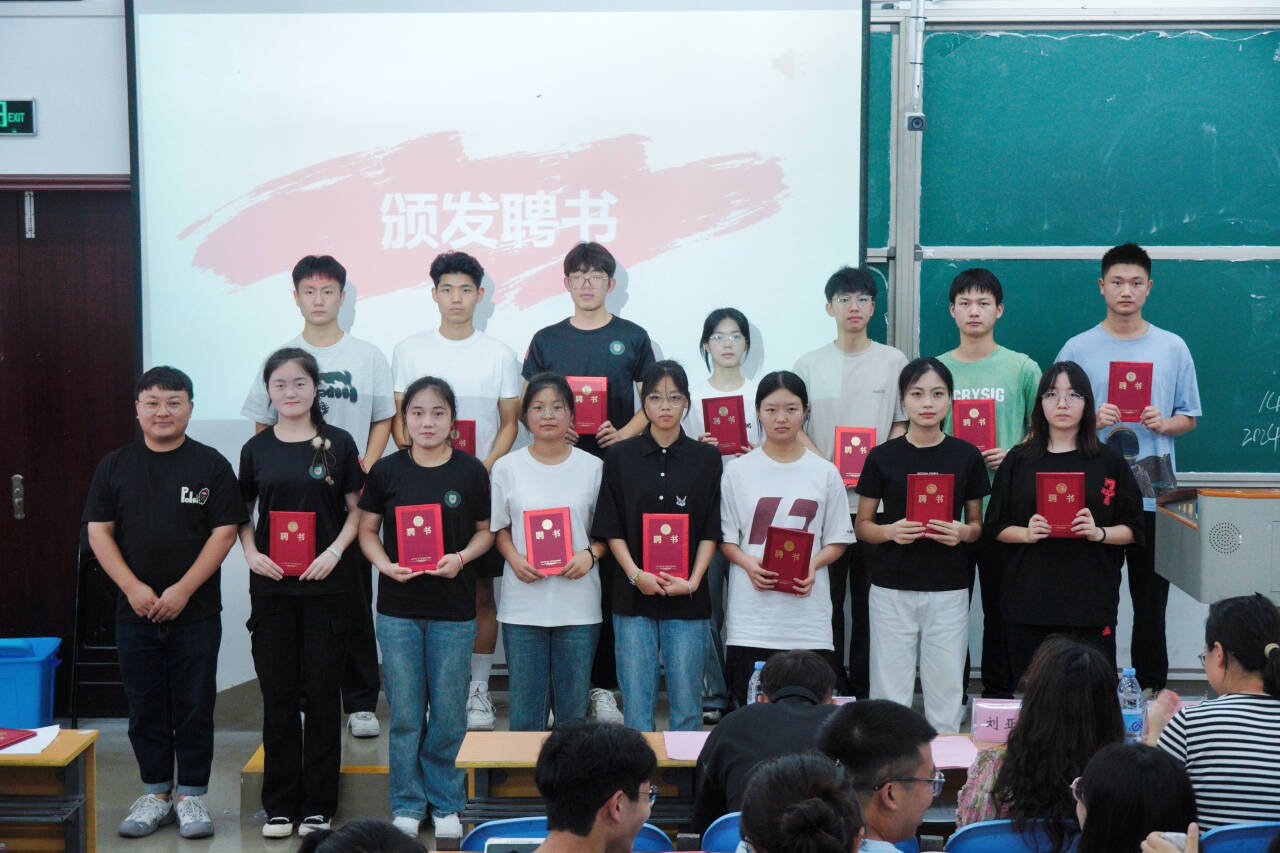 吴珊老师为校团委学生干部颁发聘书并合影留念