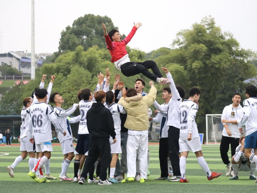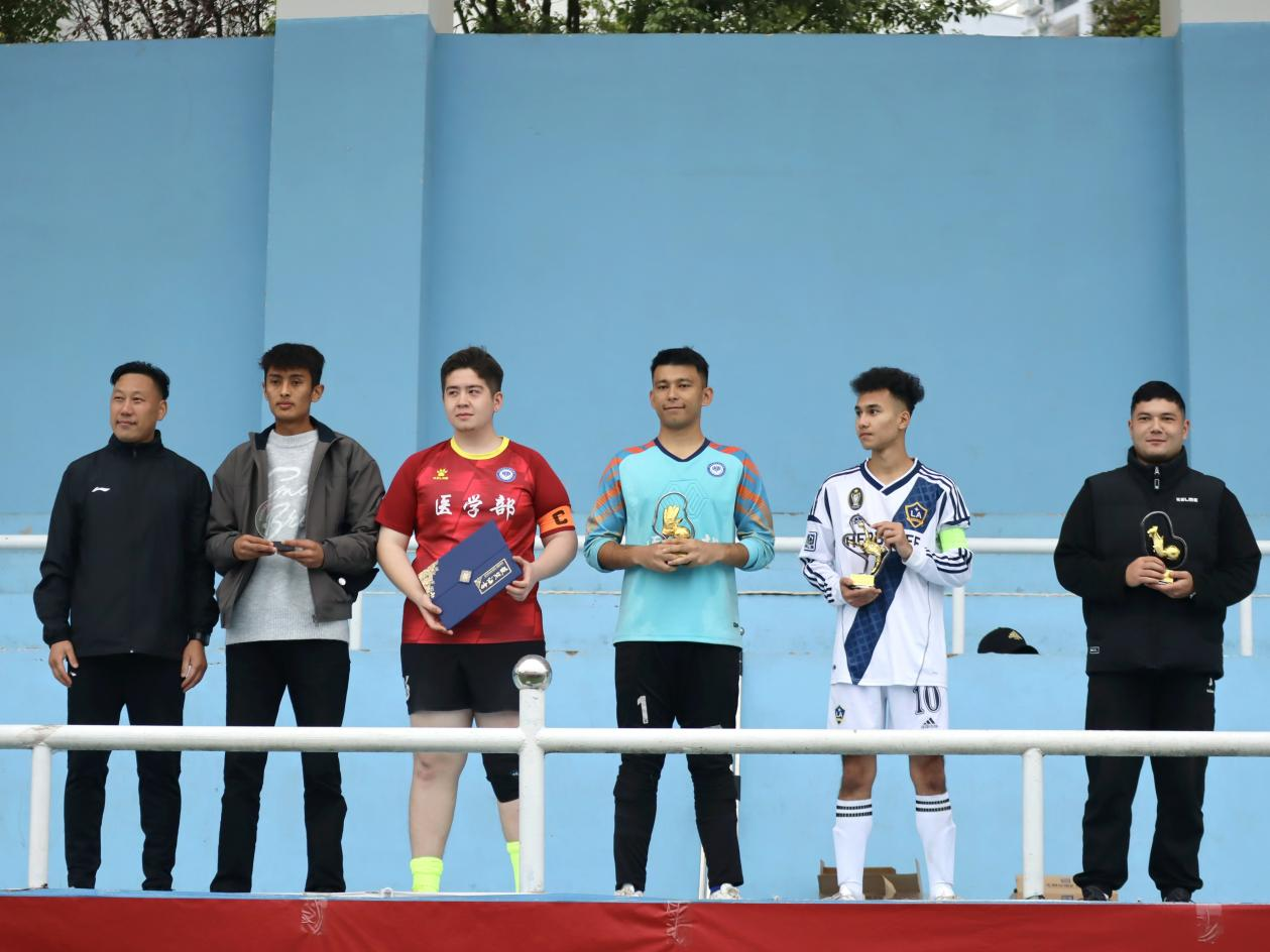 下半场,双方战局焦灼,常规时间结束后仍未分出胜负。双方进入点球大战,前三轮中双方皆是踢进两球。第四轮成为决定胜负的关键一轮,教师教育学院7号吾买尔进球,医学部21号白玛郎加射门被扑。第五轮由教师教育学院守门员江村赤列进行主罚,伴随主裁的哨响,球应声入网。教师教育学院摘得第二届“阳光体育文化节”足球类赛事男子组的桂冠。教师教育学院的同学跑去与球员一起庆祝,在五环体育场跳起民族舞蹈。张斌老师为本次男子足球赛最佳射手木热地里·帕哈提,最佳球员艾布再尔,最佳守门员玉米提·麦麦提艾力,最佳教练员艾孜尔江·艾合买提颁奖。