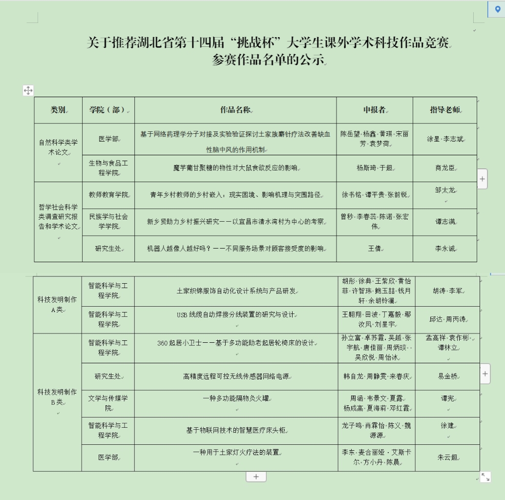 附件:关于推荐湖北省第十四届“挑战杯”大学生课外学术科技作品竞赛参赛作品名单的公示