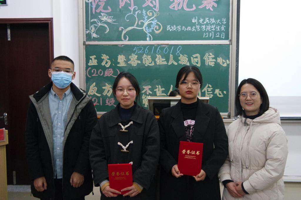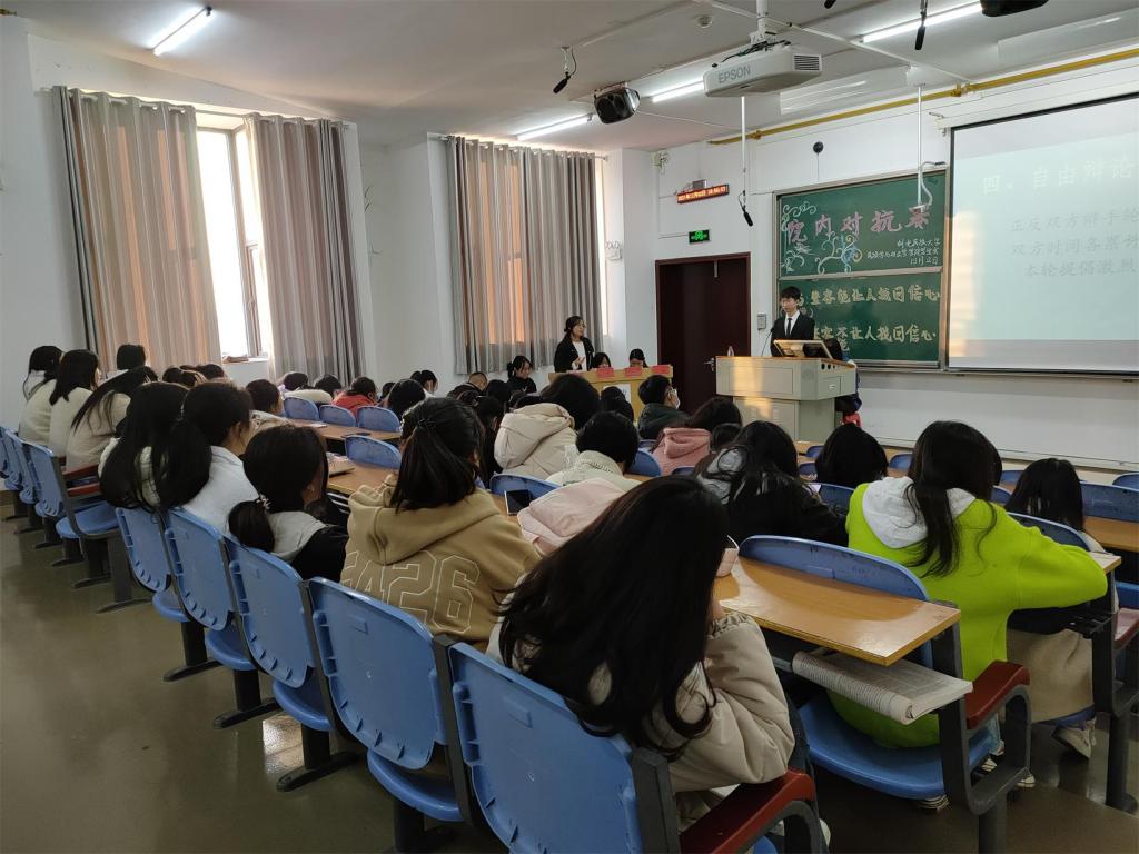 本网讯(记者 谌海容 陈慧超/文 卢子畅 董金科/图)为提升学生思维表达能力,促进学院学风建设,12月2日,我院学生会学风建设部于修远楼5A502教室开展大一大二年级辩论友谊赛。我院学生建设科科长潘华云、学生建设科副科长赵慧翔、大二社会学班主任杜鹏博士、团总支书记熊霞受邀出席本次比赛并担任评委,我院全体大一新生参加此次活动。