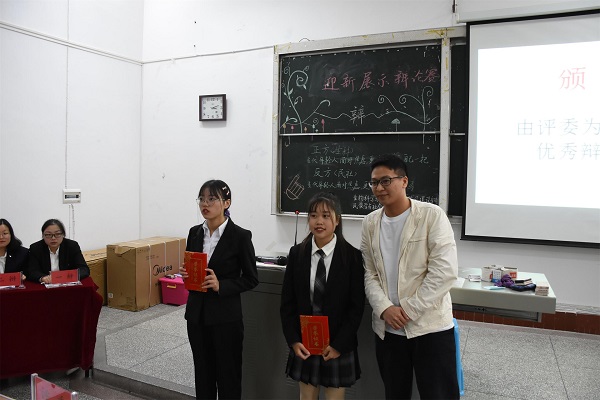 本网讯(记者 张筱玉/文 武依帆/图)为丰富校园文化生活,提高大学生思辨能力,10月8日,我院在生物科学与技术学院4202教室成功举办迎新辩论展示赛。我院优秀辩手何套、黎萍娴、生物科学与技术院优秀辩手李佩霖、涂靖担任本次比赛评委,我院大一新生及生物科学与技术学院大一新生观看此次比赛。在此次比赛中,我院学生谭芳、生物科学与技术学院学生孙瑜以优异成绩获得本次比赛的优秀辩手。