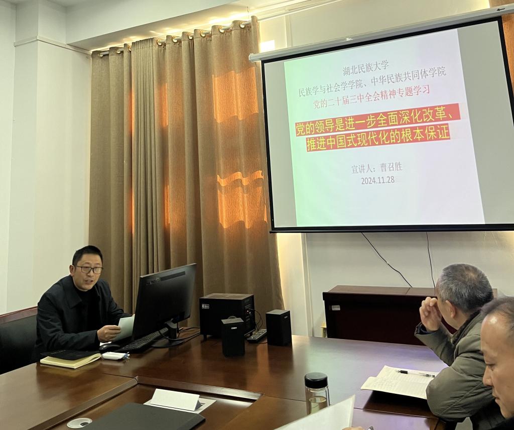 (本网讯 张雯)为深入学习宣传贯彻党的二十届三中全会精神,全面准确理解《中共中央关于进一步全面深化改革、推进中国式现代化的决定》,11月28日,我院党总支书记曹召胜以“党的领导是进一步全面深化改革、推进中国式现代化的根本保证”为主题,在学院5B1205会议室为全院教师开展了一次专题宣讲活动。