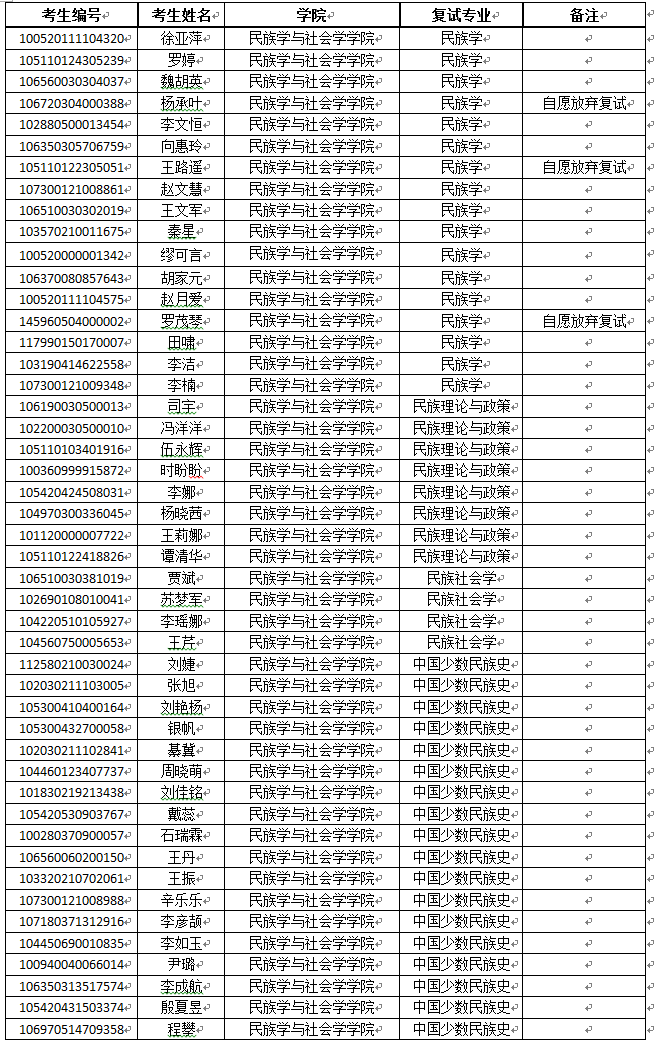 365电子娱乐官方网站民族学与社会学学院2020年硕士研究生招生复试名单(调剂生)